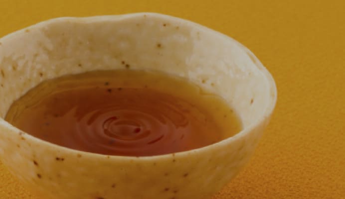 鳥海山を望む秋田沖の深海から獲れた真鱈のしょっつる「うわてん」入りの白だし。素材に旨みを効かせ、食材の色をいかす調味料
